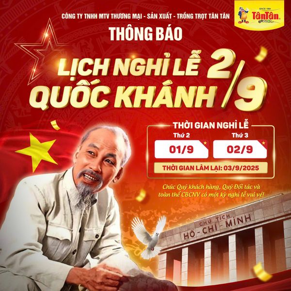 Nhân dịp kỷ niệm Ngày Quốc khánh 2/9, Công ty TNHH MTV Thương mại – Sản xuất – Trồng trọt Tân Tân trân trọng xin thông báo lịch nghỉ lễ như sau: